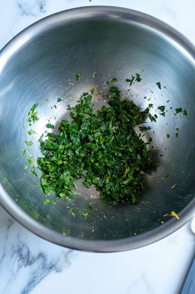 - Meanwhile, in a large mixing bowl combine the chopped herbs, the olive oil and the lemon zest.1/3 cup chopped flat-leaf parsley, 1/3 cup chopped fresh basil, 1 tbsp chopped fresh mint, 1 tbsp chopped fresh chive, 1 tbsp olive oil, 1/2 tsp lemon zest
