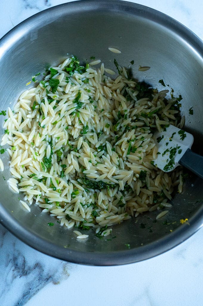 When the orzo has cooked, drain well and then add it to the bowl with the fresh herbs.